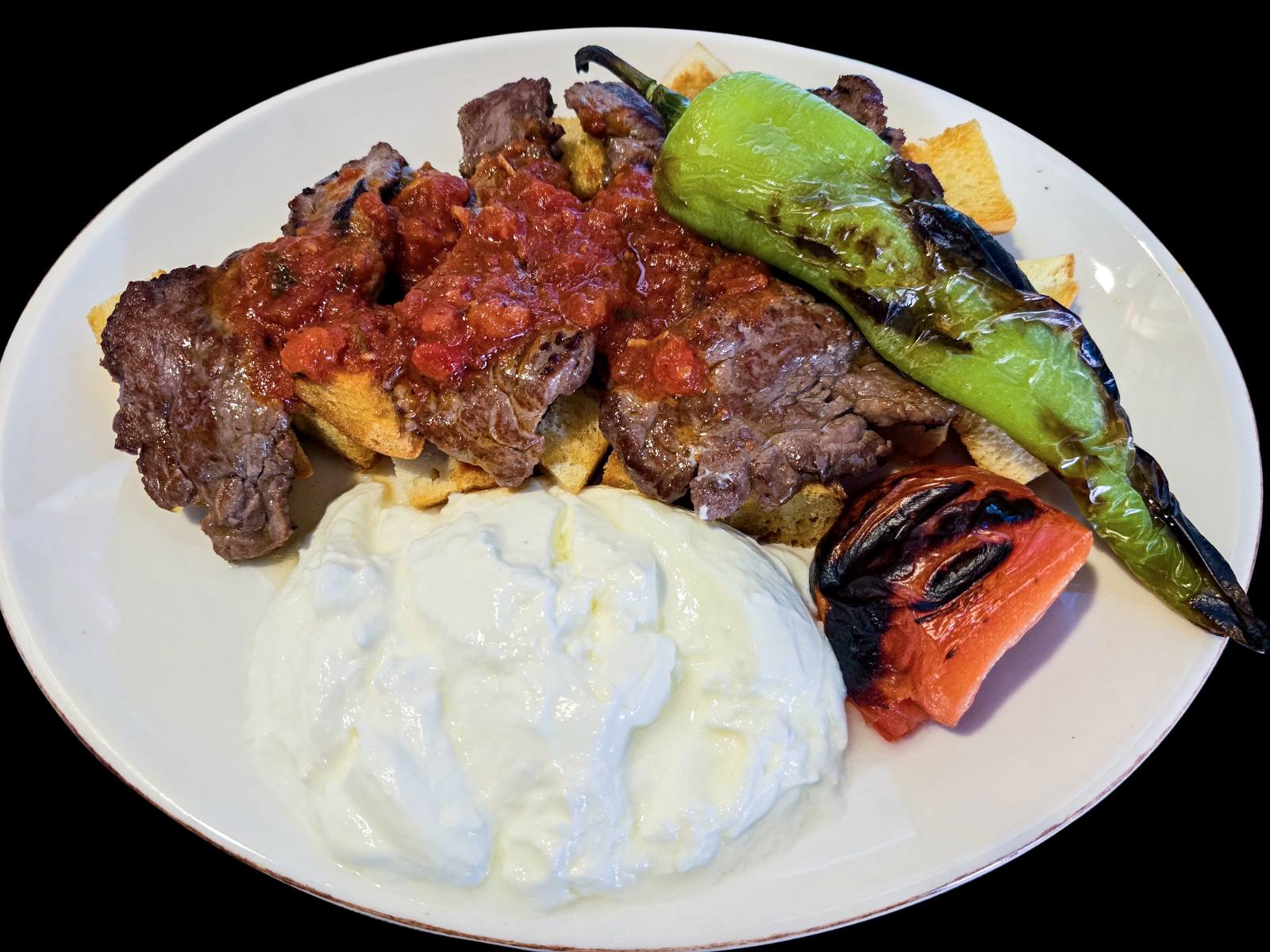 veal loin covered with hot tomato sauce, on pieces of pita bread and generously drizzled with hot cow butter, topped with yoghurt