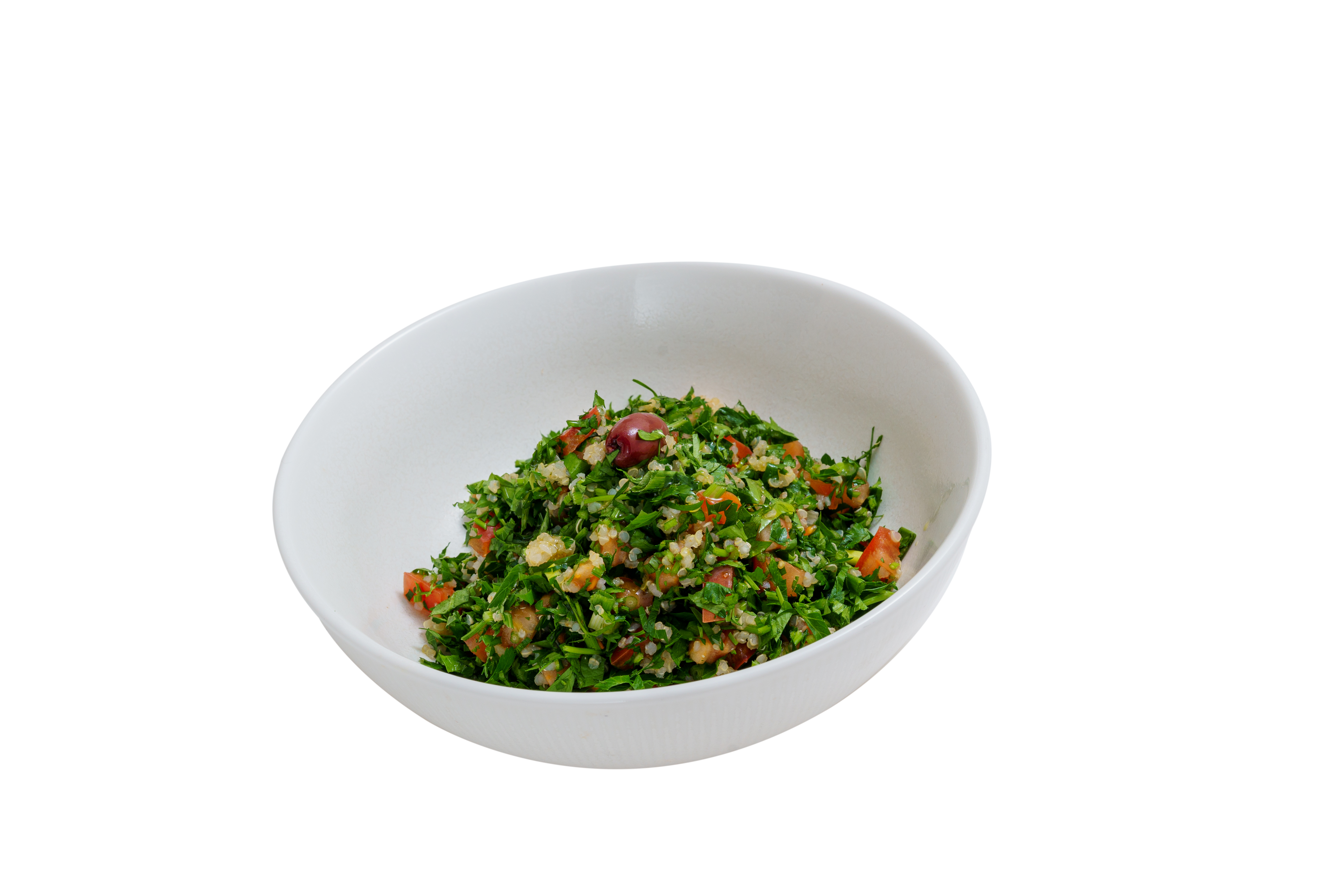 a combination of parsley, green onion, mint, tomato and quinoa seasoned with olive oil and lemon juice