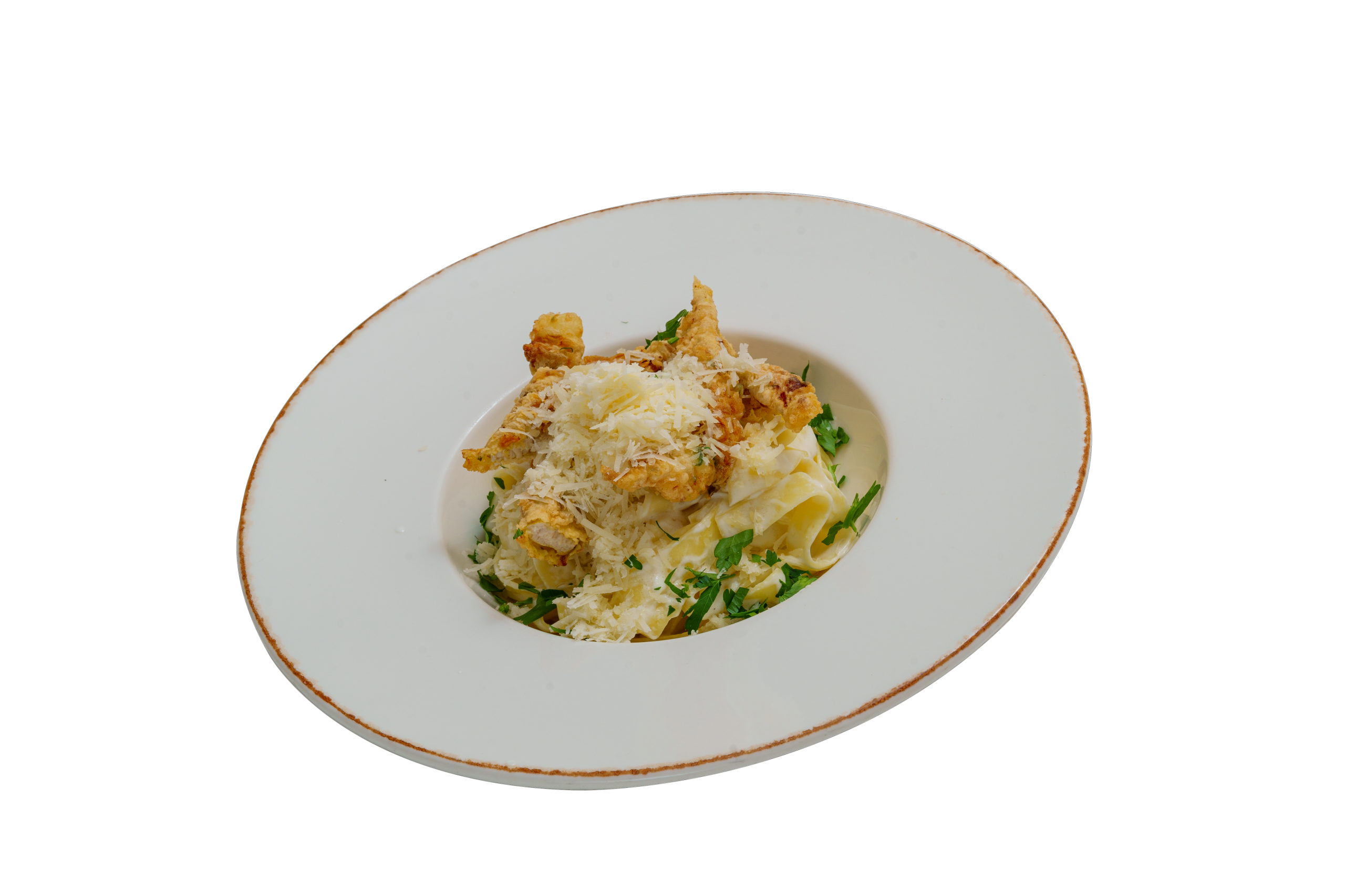 tagliatelle in a light garlic cream with cow butter and parmesan, served with crispy chicken and parsley