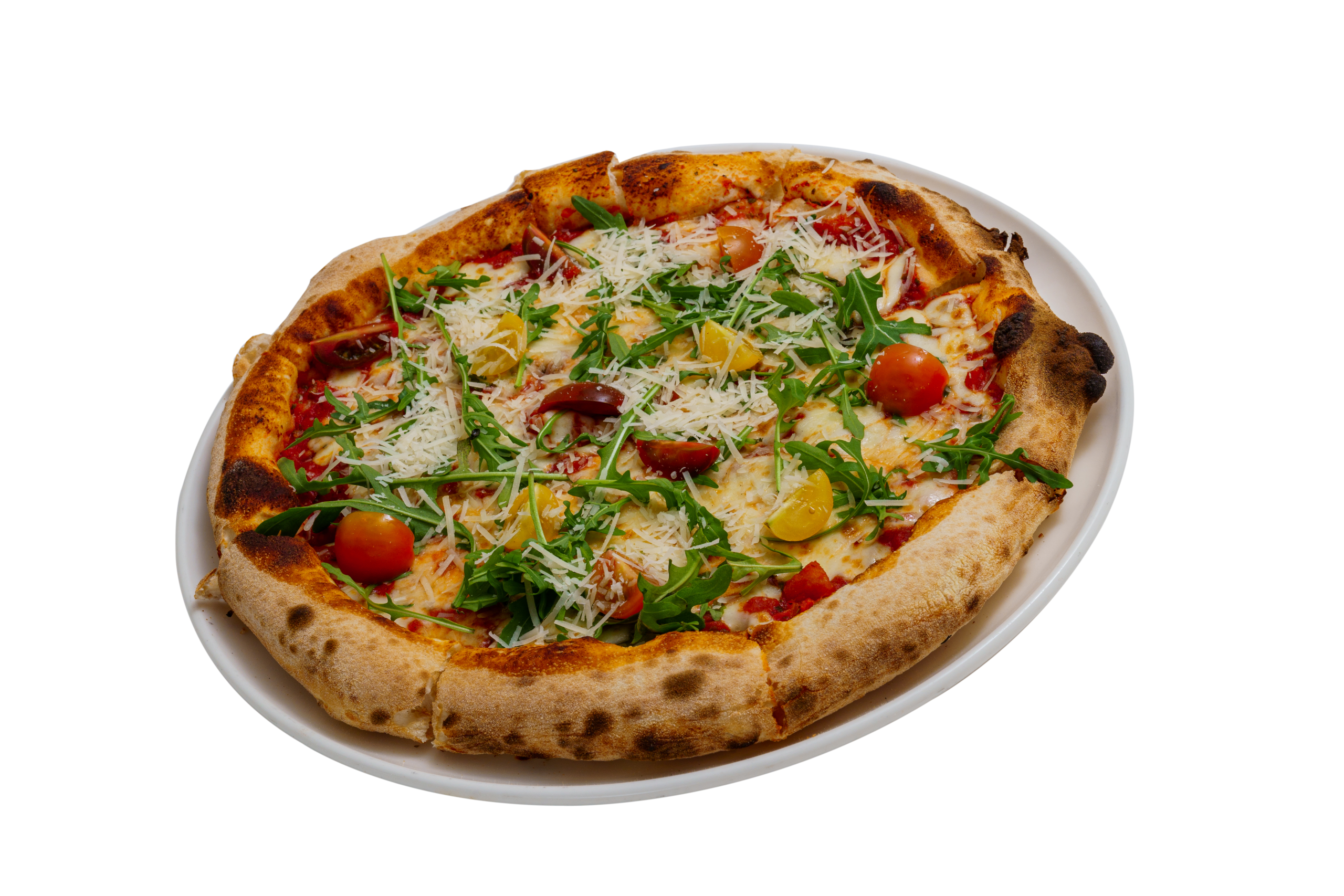доматен сос, моцарела, рукола, чери домати, пармезан