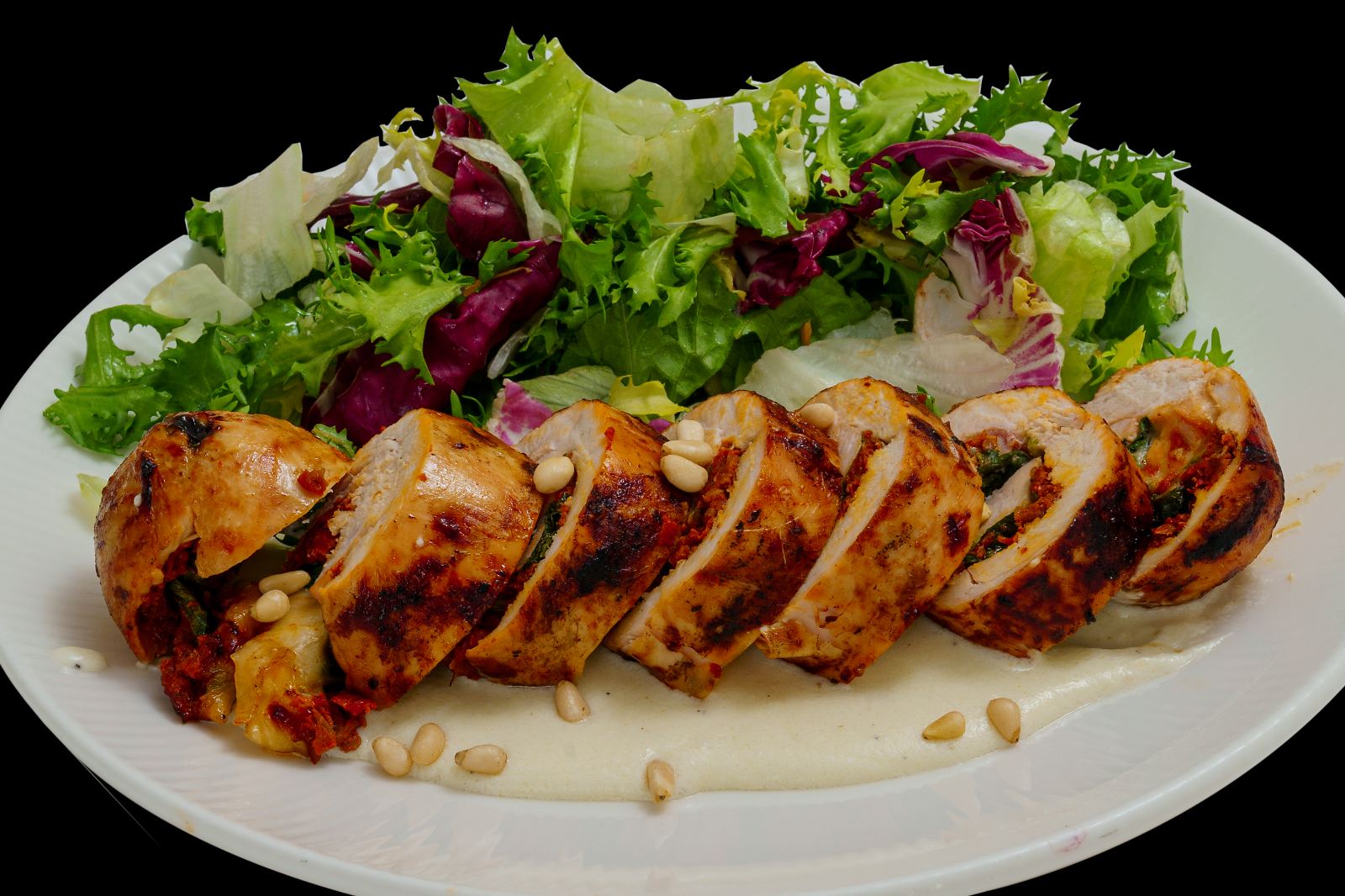 сладост от сушени домати и топяща се ммоцарела, поляти със сос от дижонска горчица в пълнежа, поднесена със свежа салата от рукола и бейби спанак, овкусена със зехтин и ломонов сок