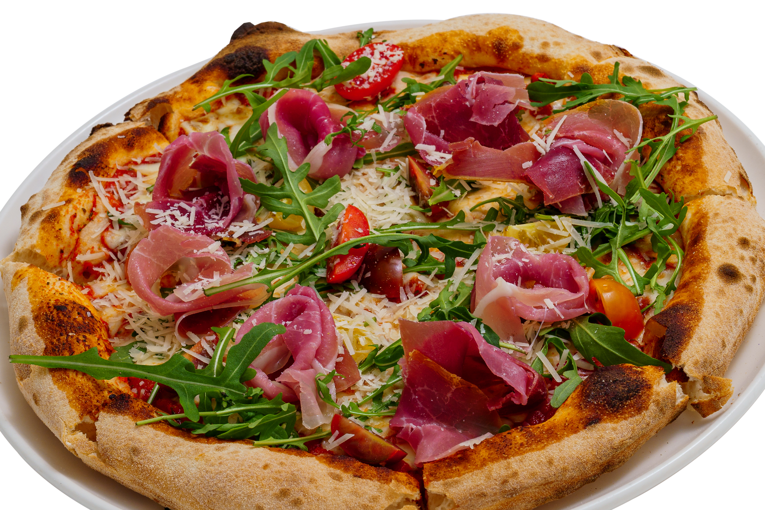 доматен сос, моцарела, прошуто ,,Крудо", рукола, чери домати, пармезан