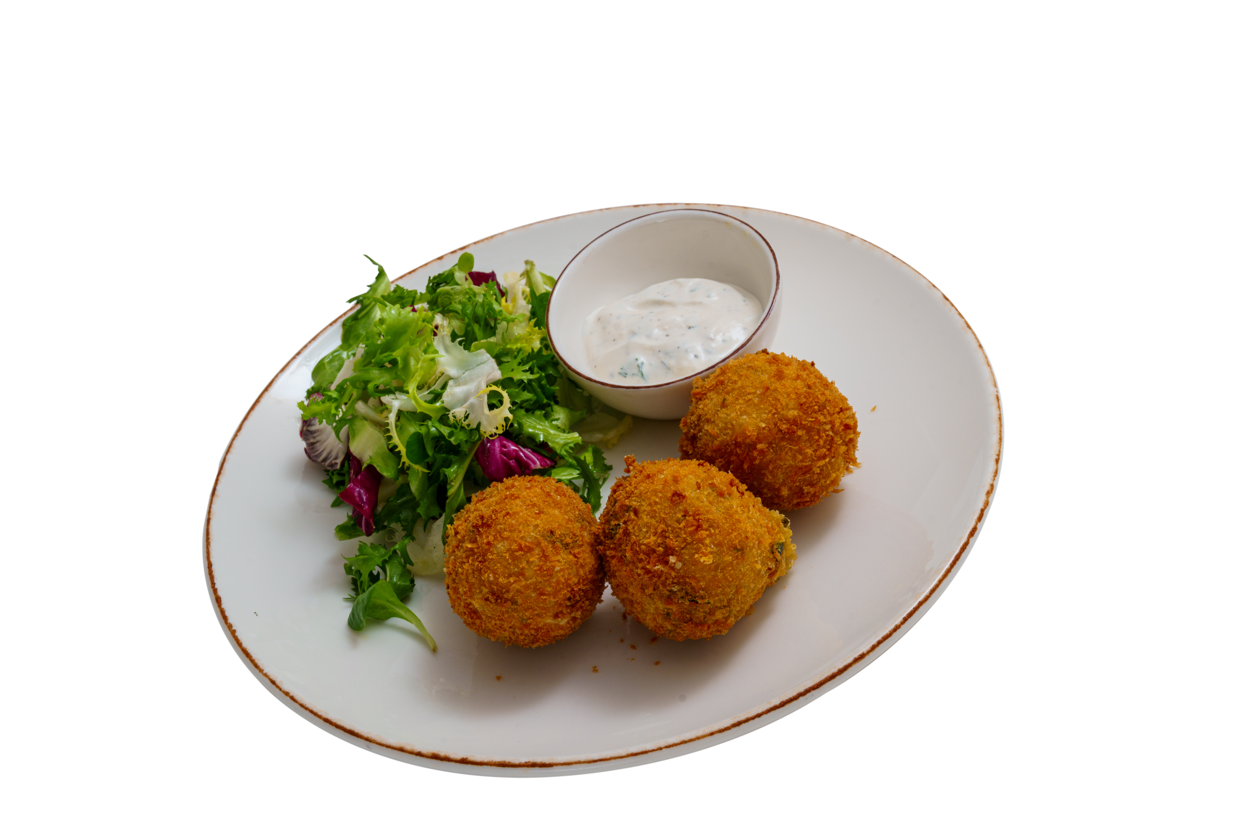 cheddar, parmezan, ceapă verde și cimbru, acoperit cu sos de lapte și usturoi și salată verde