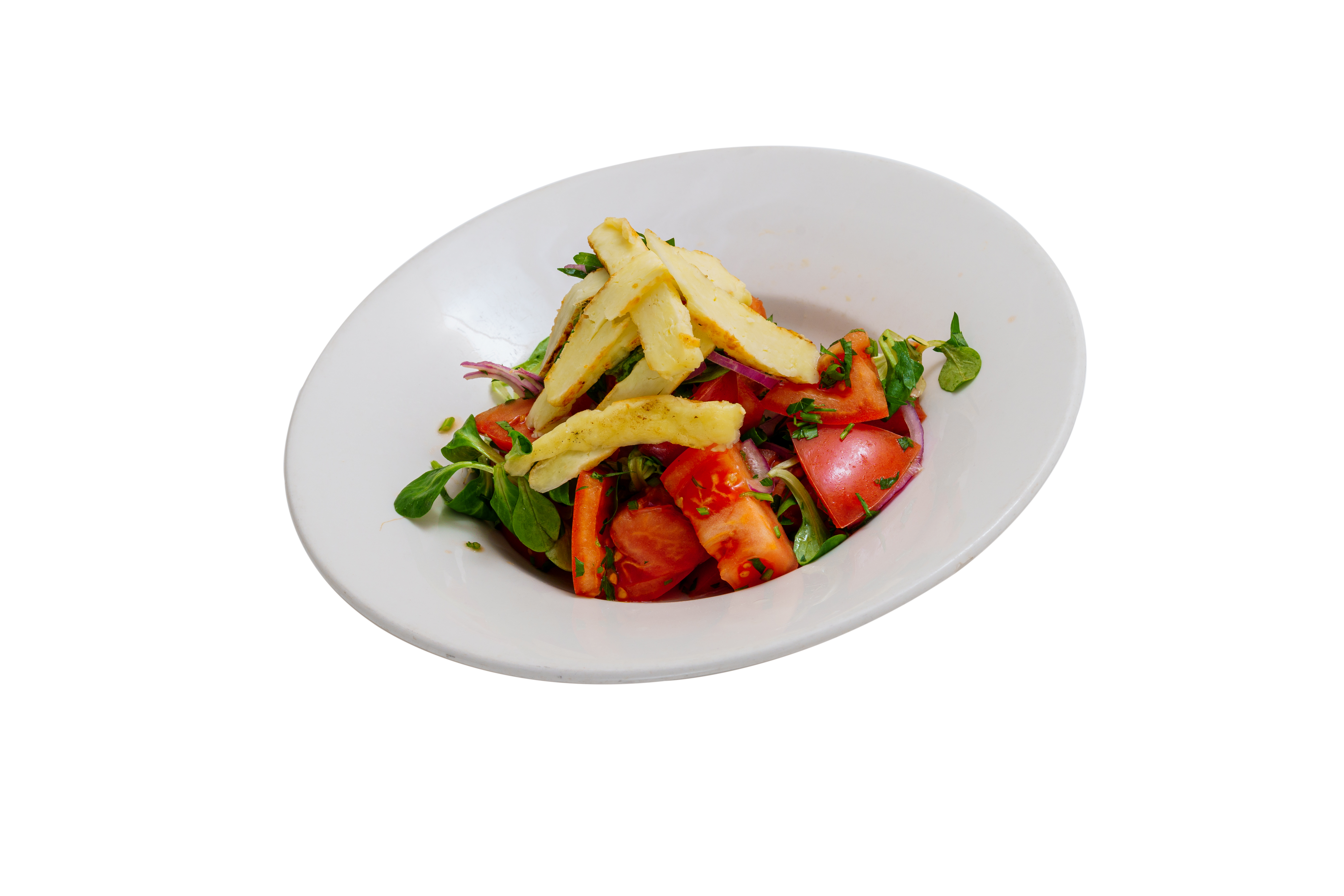 roșii, pătrunjel, ceapă verde, ceapă roșie, brânză halloumi coaptă