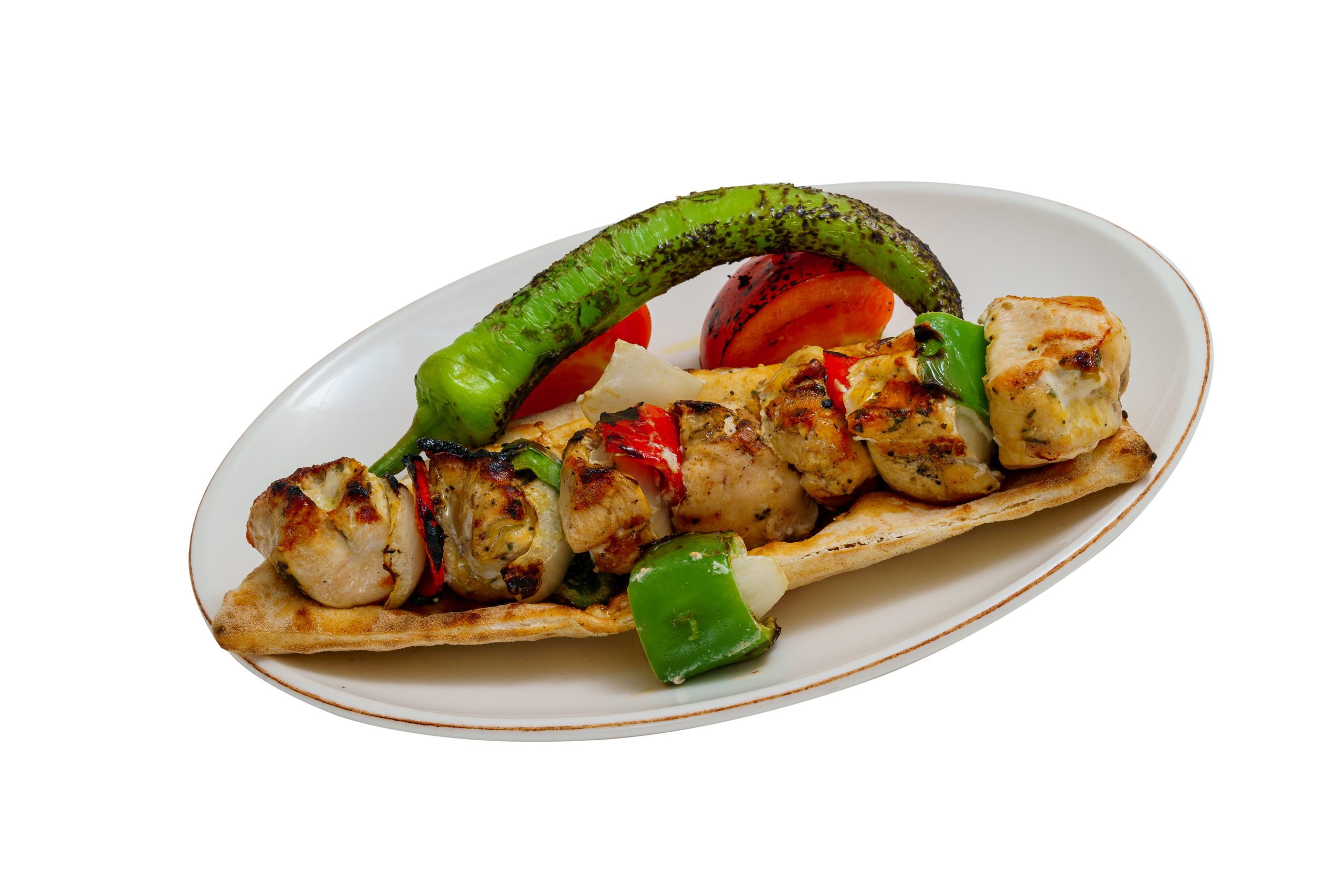file de pui marinat la grătar acoperit cu ciuperci la grătar, roșii, pioer proaspăt și pâine pita arabă autentică